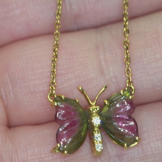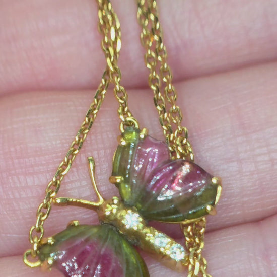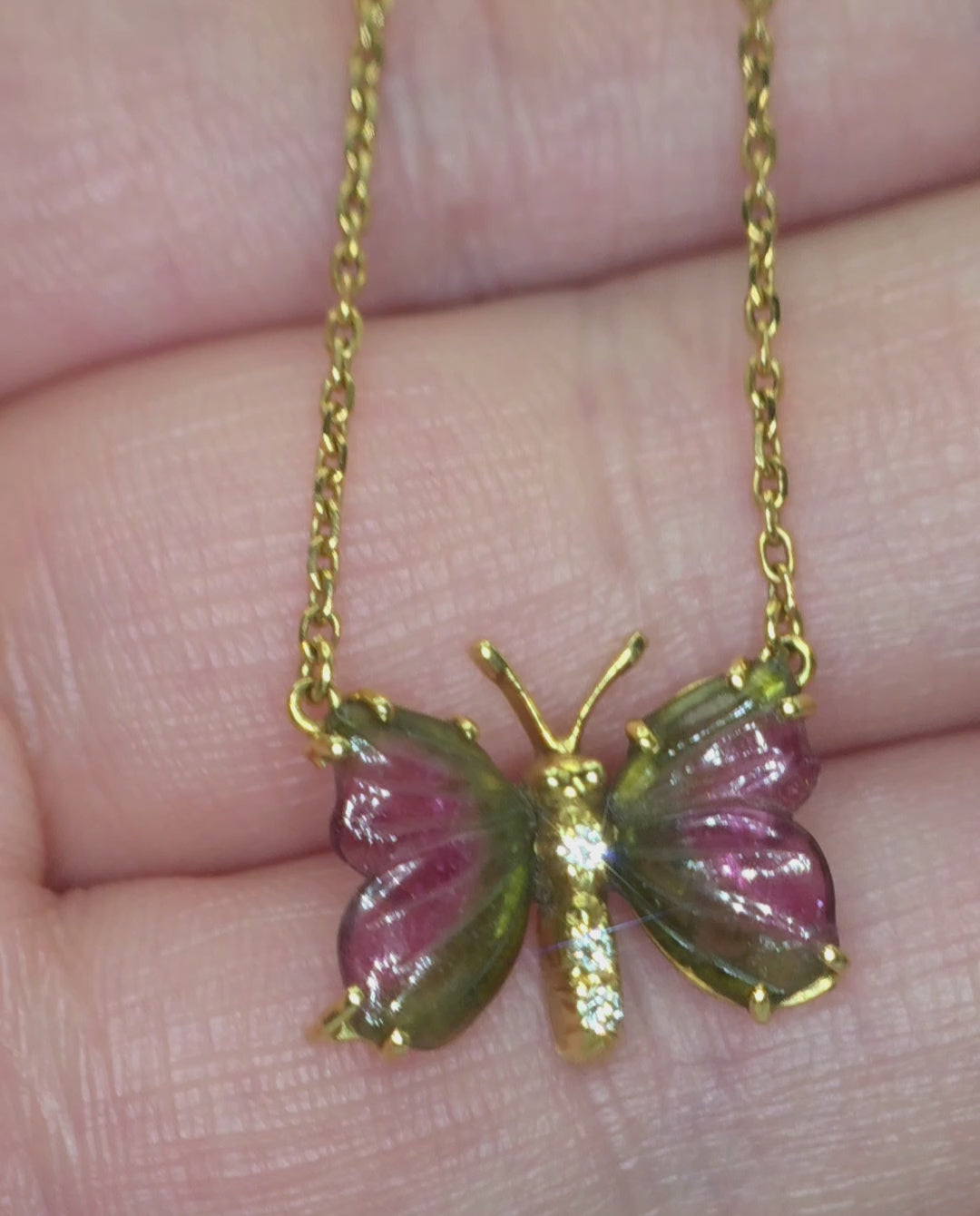 18ct Yellow Gold, Watermelon Tourmaline and Diamond Butterfly Necklace